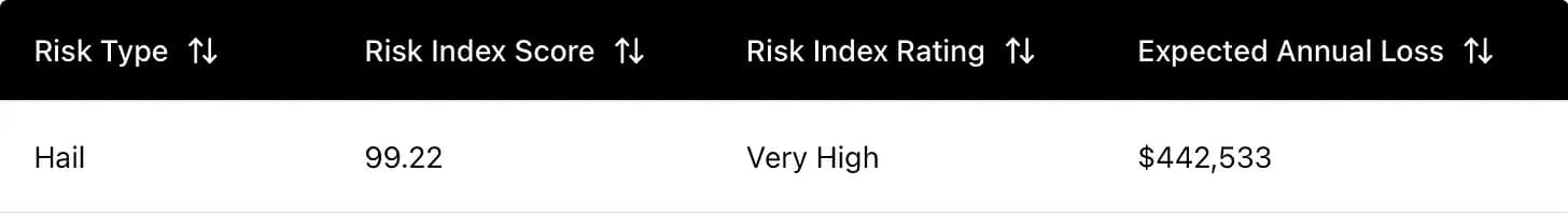The risk index score, rating, and expected annual loss of hailstorms in Golden, Colorado (data provided by StatisNostics).