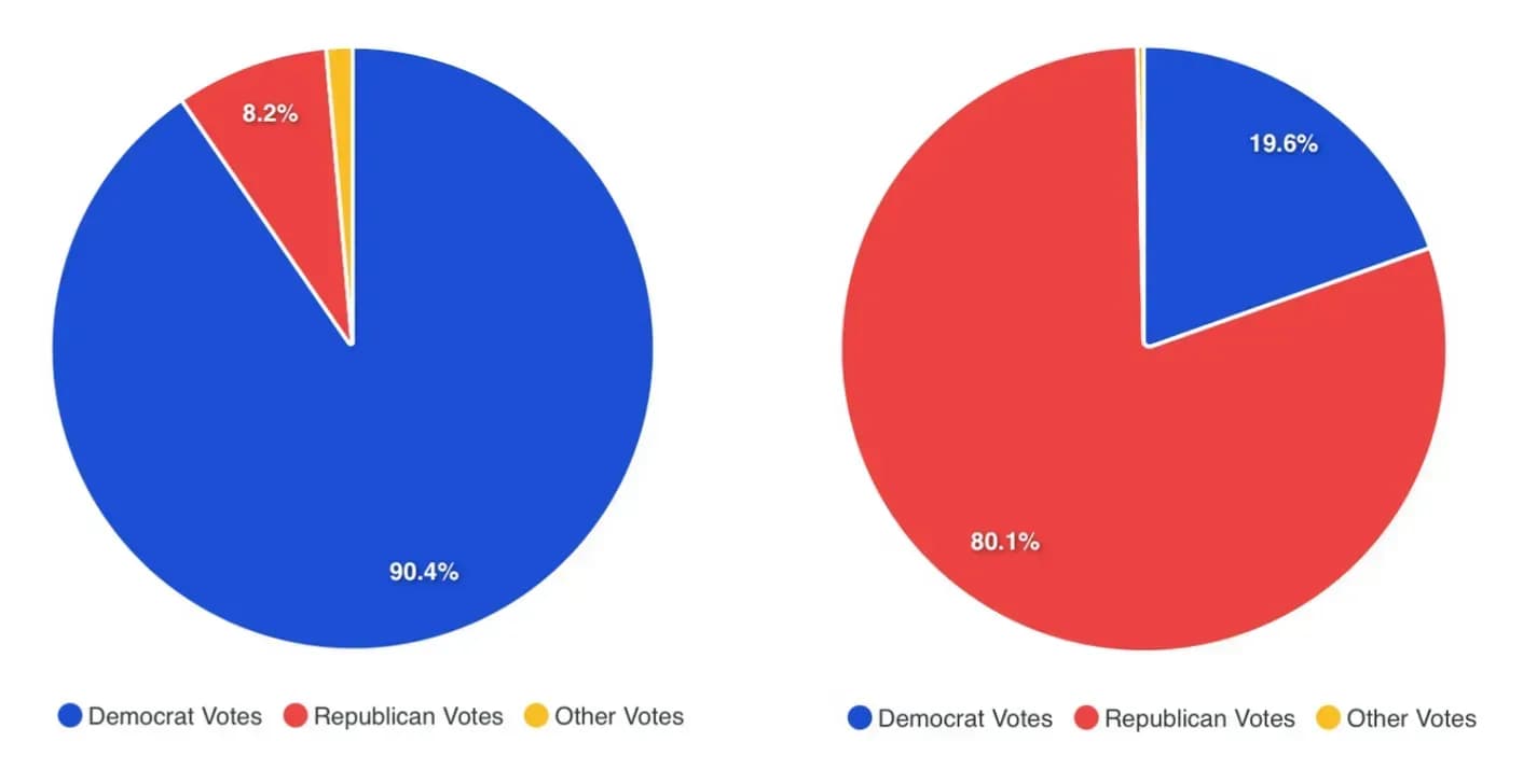 Moving on to Michigan, voters in Lansing voted 21.6% Republican and 76.2% Democrat— a stark contrast from voters in Harrison, MI who voted 65.8% Republican and only 32.4% Democrat.