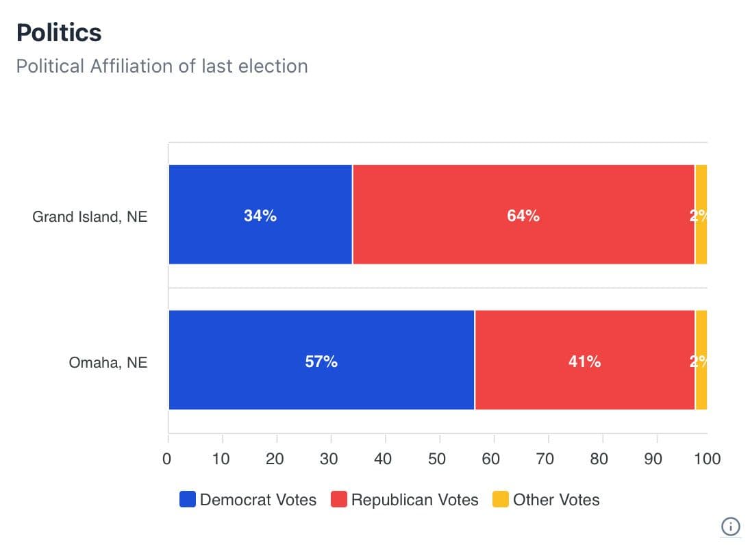According to StatisNostics, a database that utilizes U.S. government census data, Grand Island, NE (the fourth largest city in Nebraska) has a voter ratio of 64% Republican and 34% Democrat (2% other). Most Nebraskan cities also follow this trend. However, Omaha has a voter ratio of 41% Republican and 57% Democrat (2% other). The Democratic majority in Omaha is what worries state residents.