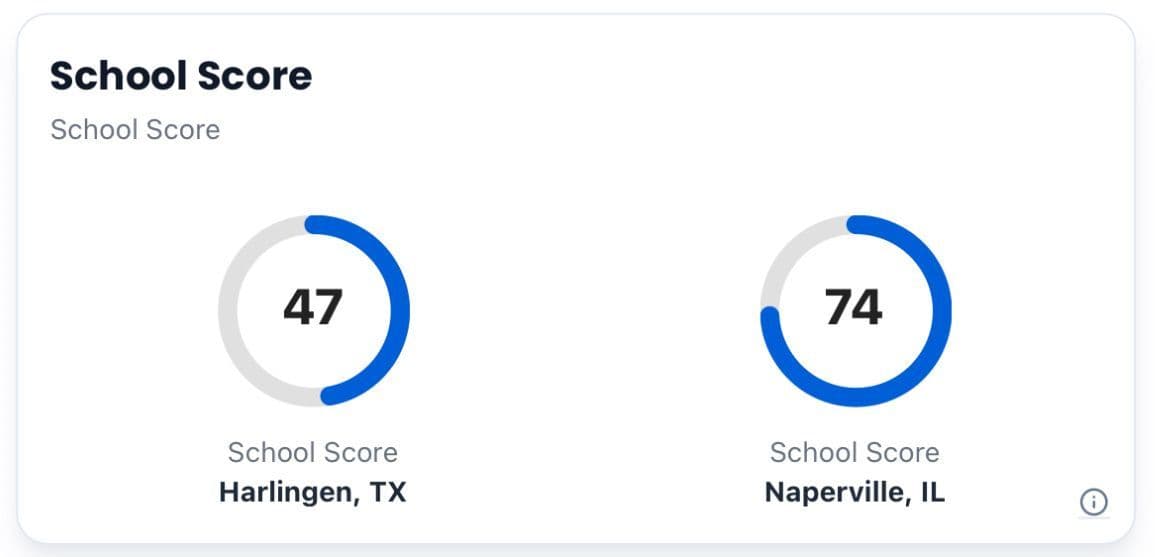 We took Naperville, IL, a U.S. city with a high composite school score, and compared it with Harlingen, TX, a U.S. city with a relatively low one. Naperville has a composite school score of 74/100 with an average reading score of 69 and a math score of 79. On the flip side, Harlingen has a composite score of 47 with an average reading score of 48 and a math score of 45.