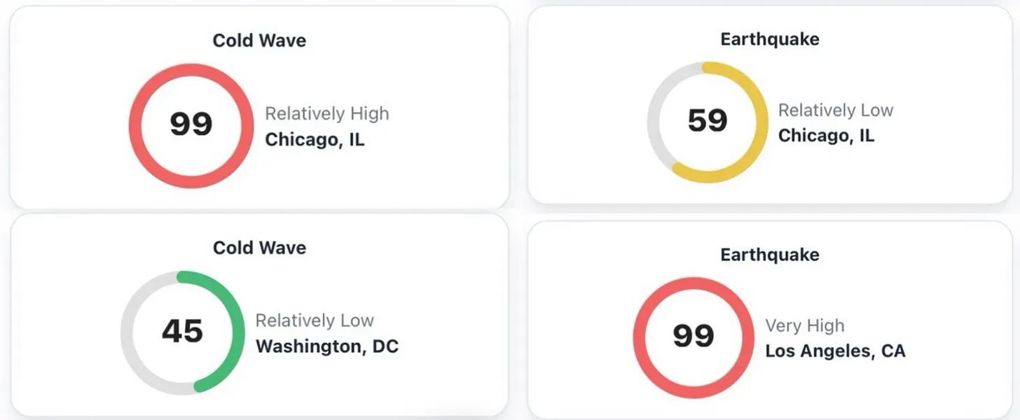 StatisNostics.com gives the FEMA RISK data for every town and city in the country, including the risk index score and risk index rating. The database is also able to compare the risk from city to city using U.S. government census data. For instance, Washington, D.C. is at a relatively low risk of cold waves while Chicago has a very high risk. At the same time, Chicago has a relatively low risk of earthquakes while Los Angeles has a very high risk.