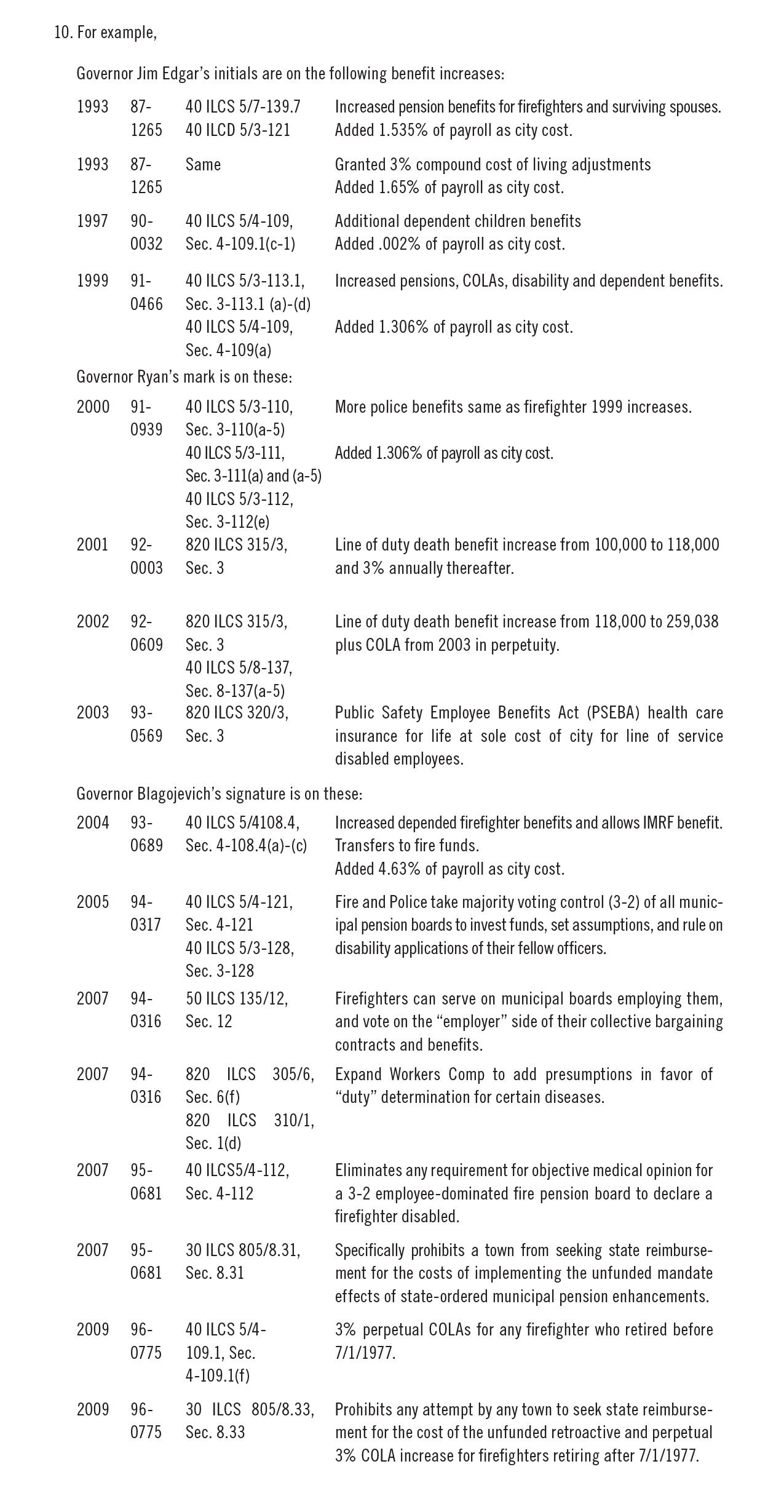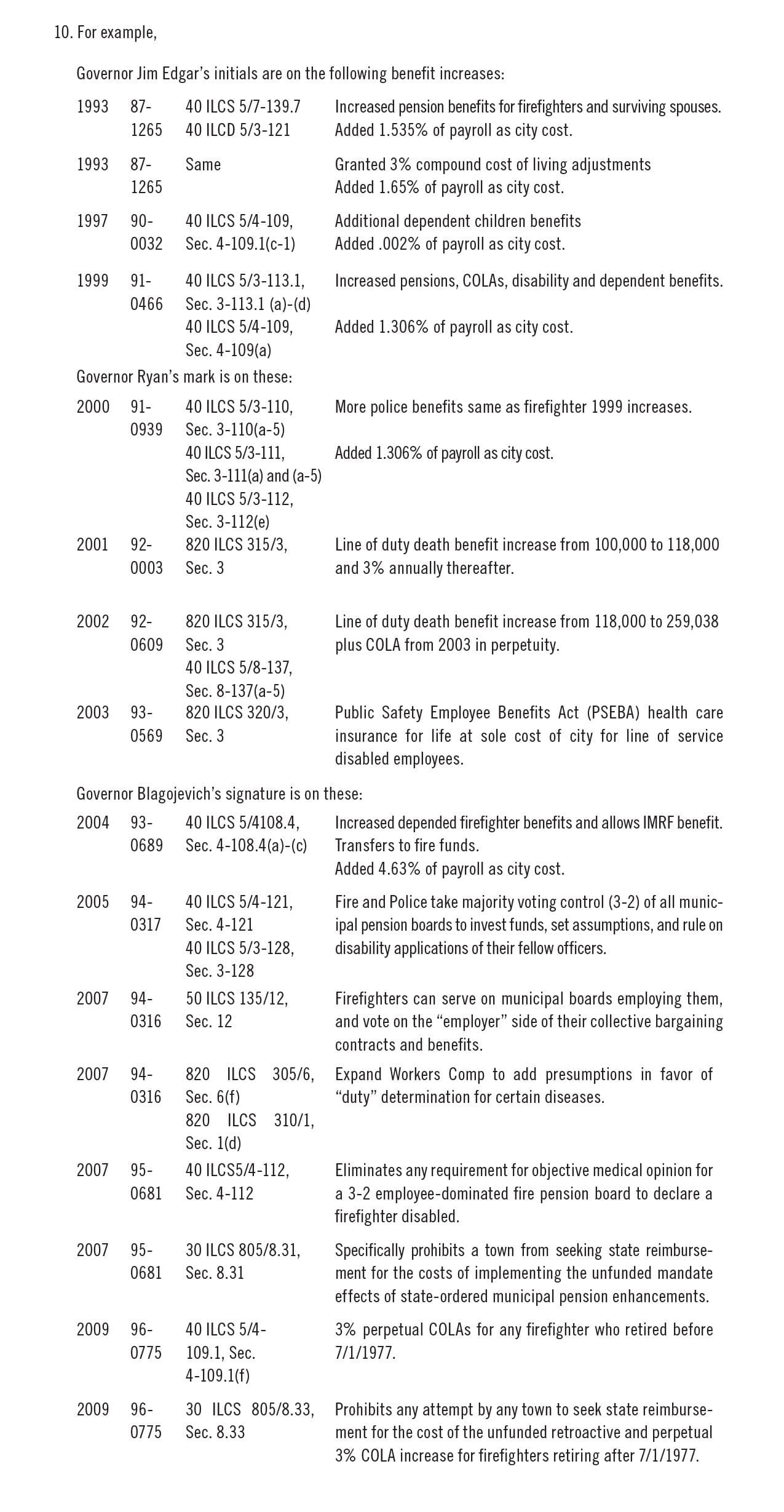 So as we pause on our downward journey, like the explorers in the story, who were guided by the carved initials on the walls of rock they passed, we can see the initials of various legislators etched into the public laws enacting these increased benefits, pushing each town deeper into spending. We can also see the names of Illinois Governors traced on various pension benefit increase bills.10