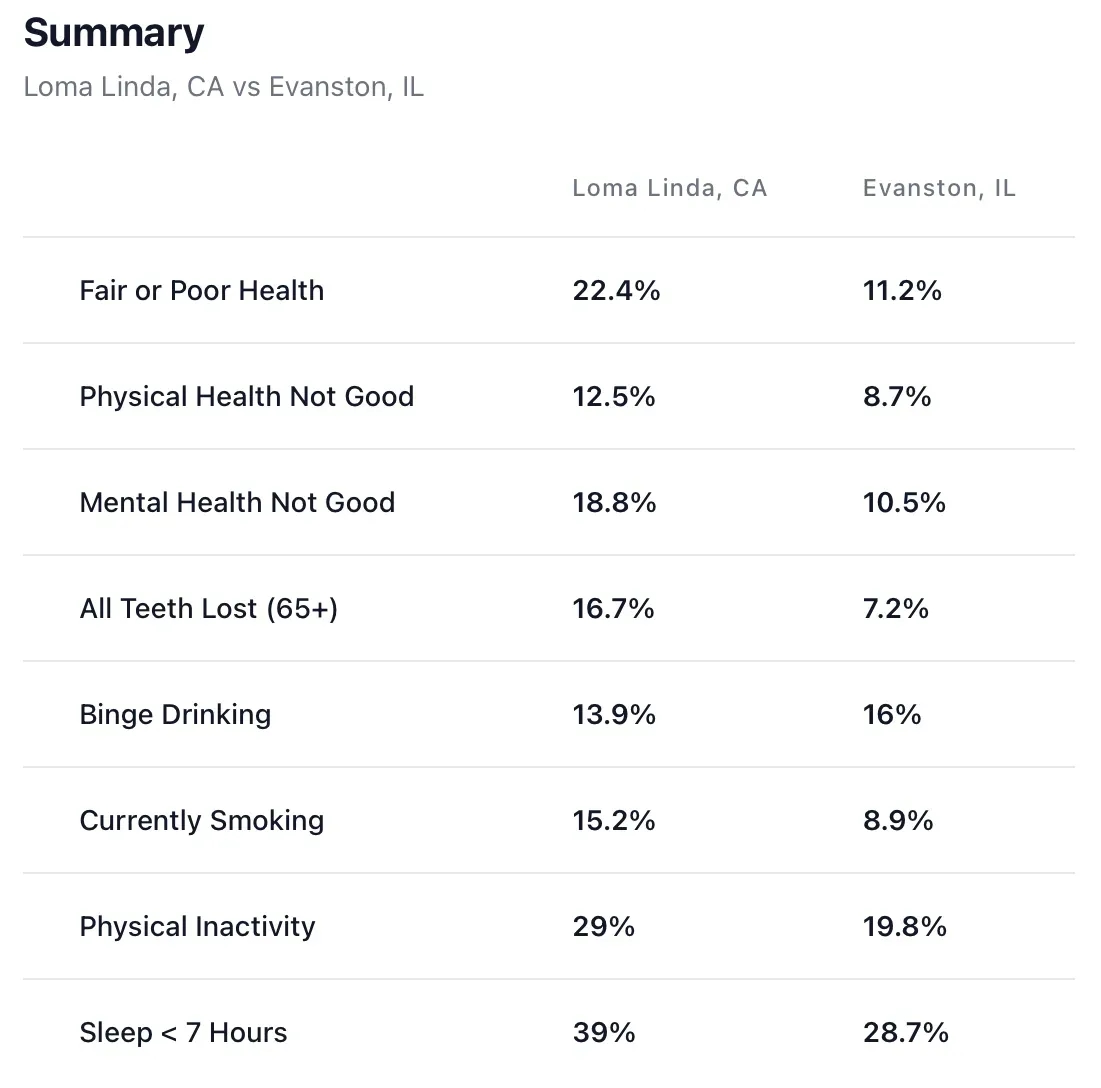 Loma Linda, CA is known for their healthy habits and long life expectancies, but StatisNostics shines a light on this discrepancy.