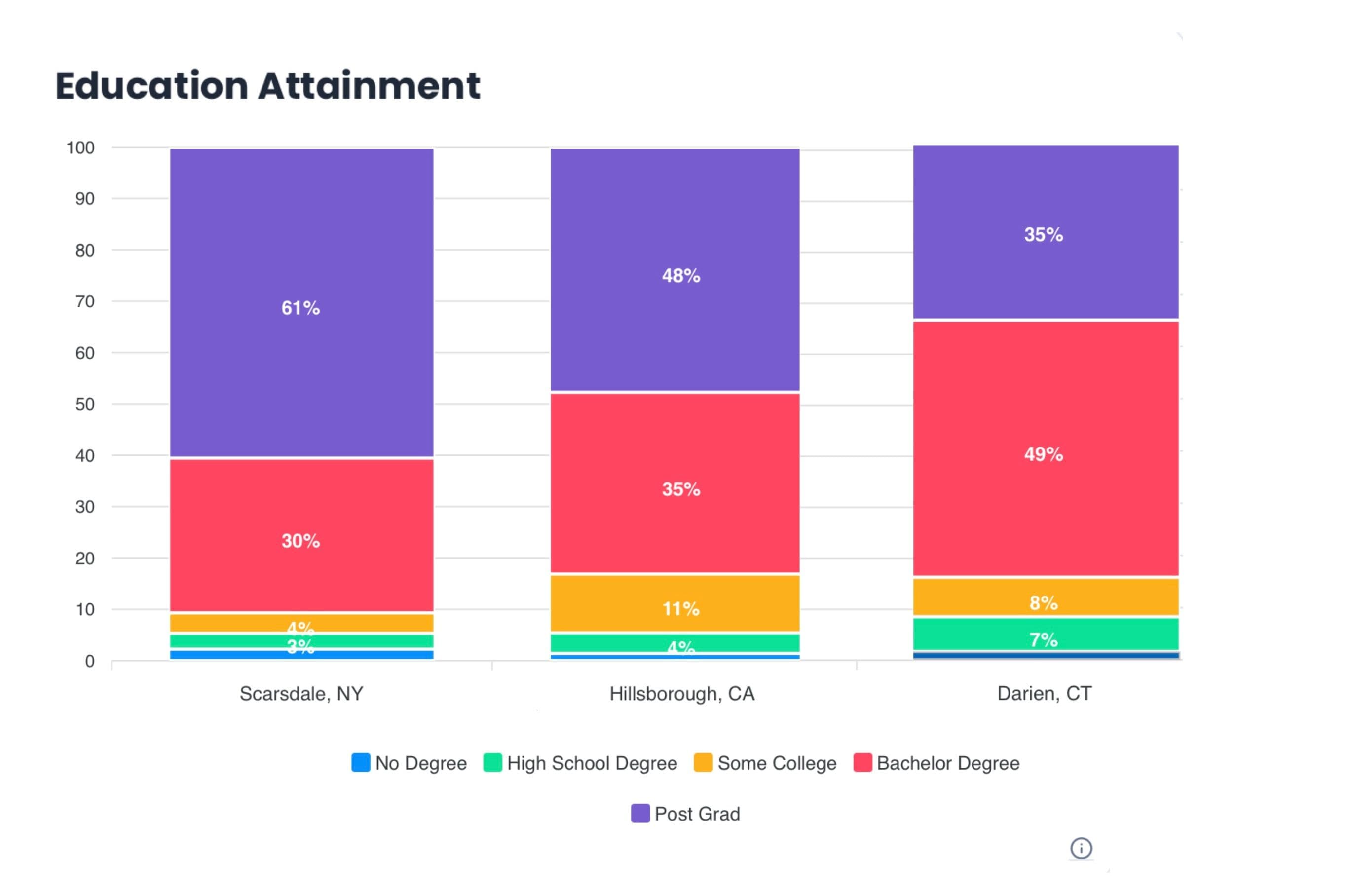 To begin our investigation, let’s look at some of the richest cities in the U.S. We’ll use Hillsborough, CA, Darien, CT, and Scarsdale, NY. According to StatisNostics, a database that utilizes U.S. government census data, Darien’s median household income rests at $248,125. StatisNostics also reports that 84% of residents received higher education (with 49% receiving their bachelor’s degree and 35% receiving a postgraduate degree). Hillsborough and Scarsdale both boast a median household income of $250,000. For these cities, we see the same trend as in Darien. In Hillsborough, 83% of residents received higher education (35% bachelor’s degree and 48% post-grad), and in Scarsdale the number reached 91% (30% bachelor’s degree and 61% post-grad). So it seems like the Bureau of Labor’s adage is holding up, for now.