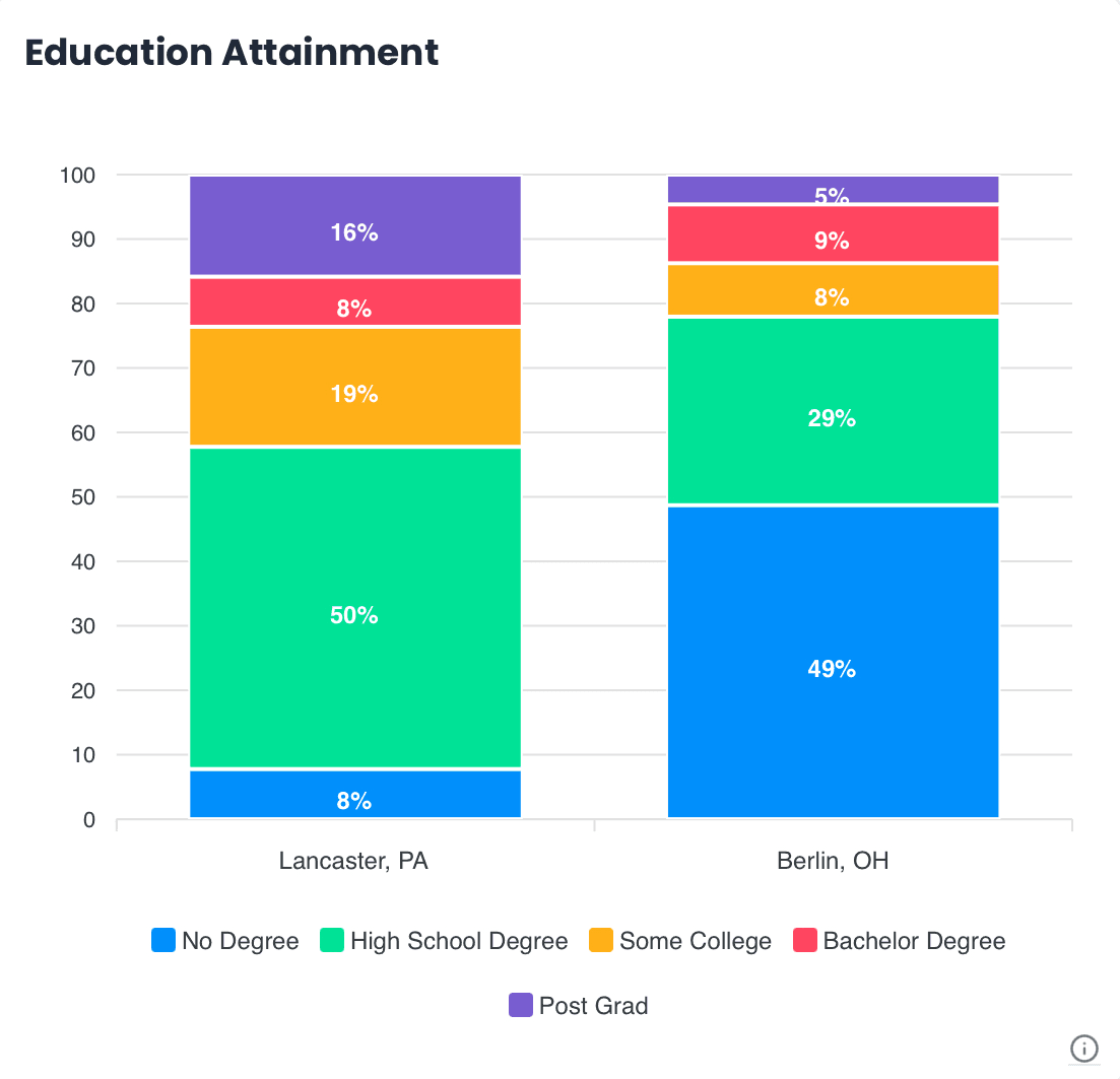 StatisNostics analyzed two of the largest Amish communities in the nation, Lancaster County, PA and Holmes County, OH. In Berlin, OH (located in Holmes County), the median household income is $72,778. While Berlin’s median income more than doubles the income of both Cleveland’s and Detroit’s, the Amish city has even lower education attainment. Only 14% of Berlin residents have obtained higher education (9% bachelor’s degree and 5% post-grad). Lancaster, PA, home to the largest Amish community in America, has a median household income of $96,250. Along with pushing six figures, only 24% of Lancaster residents have received higher education (8% bachelor’s degree and 16% post-grad). Less than a fourth of the population has completed postsecondary education, yet they’ve still been able to prosper financially.