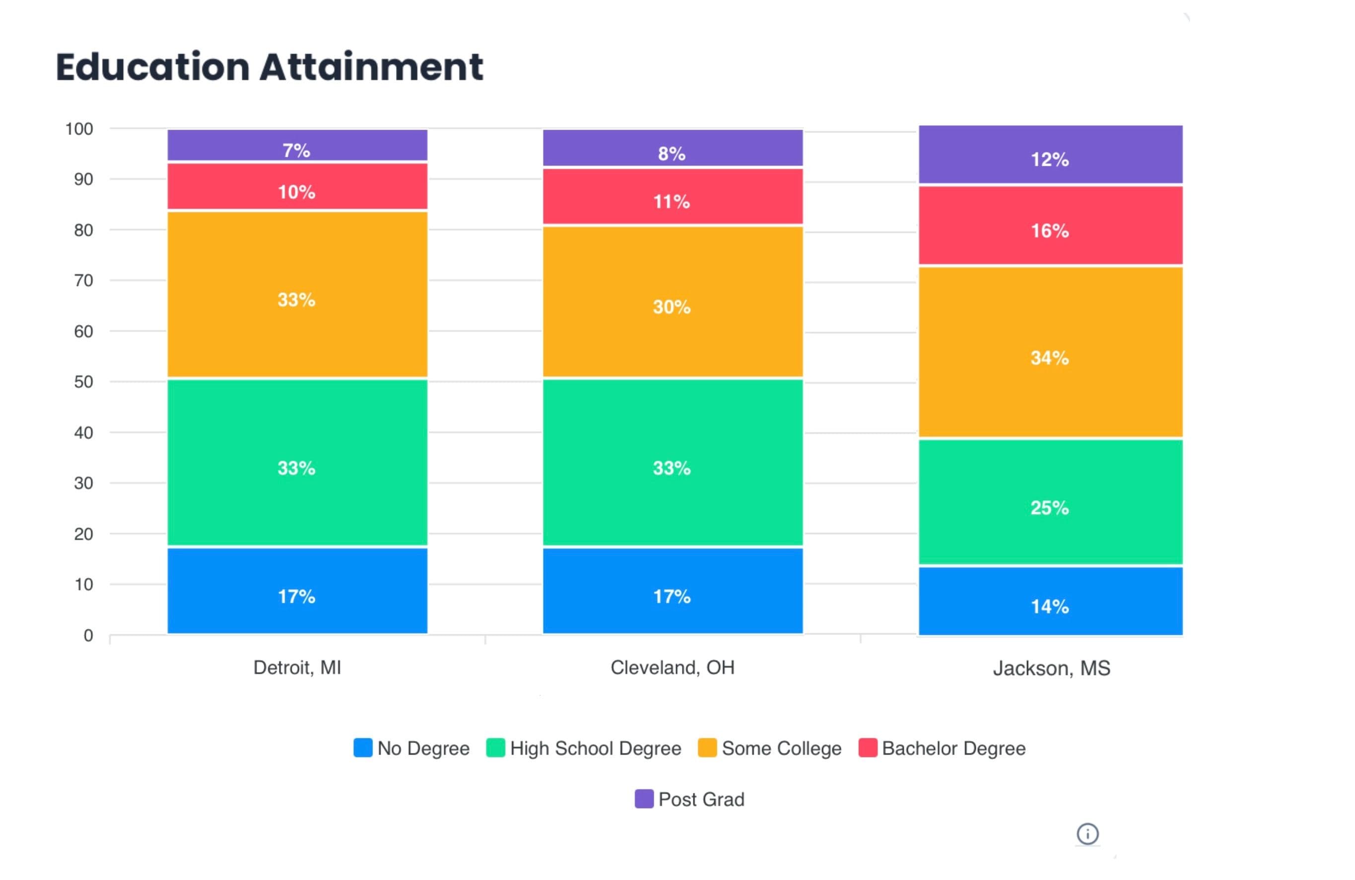 Let’s shift to some of America’s poorest cities and see if the trend continues. We’ll take Detroit, MI, Cleveland, OH, and Jackson, MS. In Jackson, the median household income is $39,969. Also in Jackson, only 28% of residents received higher education (16% bachelor’s degree and 12% post-grad). In Cleveland, the median household income is $33,678, and only 19% of residents received postsecondary education (11% bachelor’s degree and 8% post-grad). Detroit’s median household income rests at $34,762 with only 17% of residents receiving higher education (10% bachelor’s degree and 7% post-grad).
